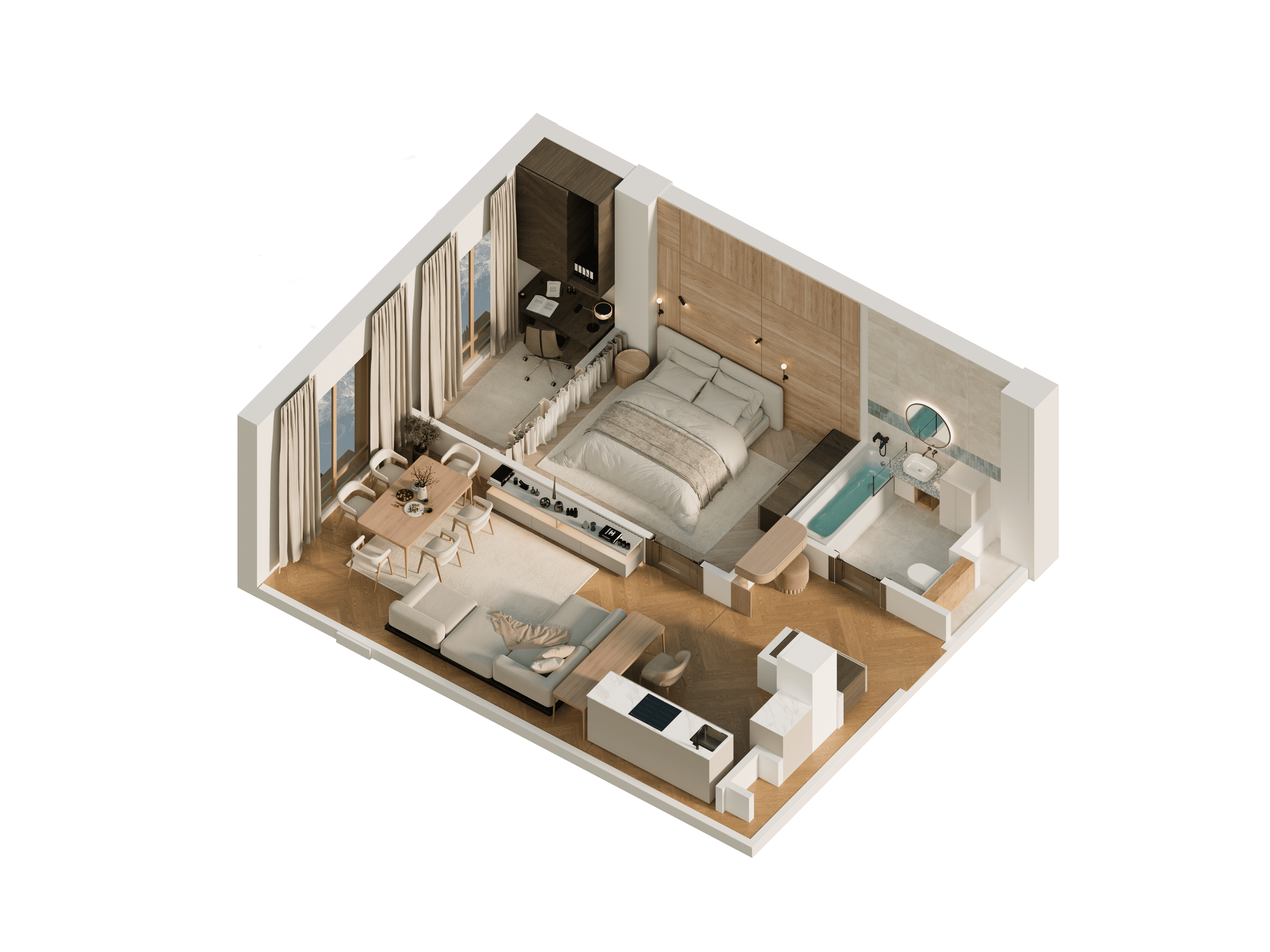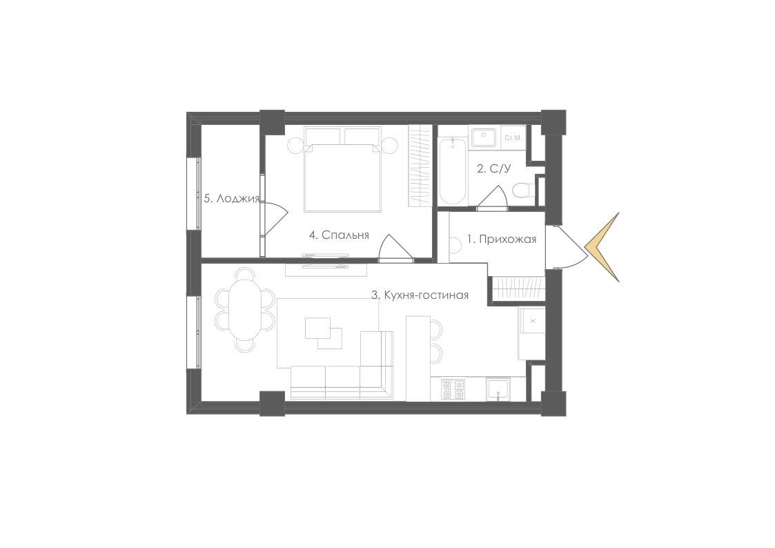 Формат «Евро». Просторная кухня-гостиная. Отсутствие лишних коридоров.
