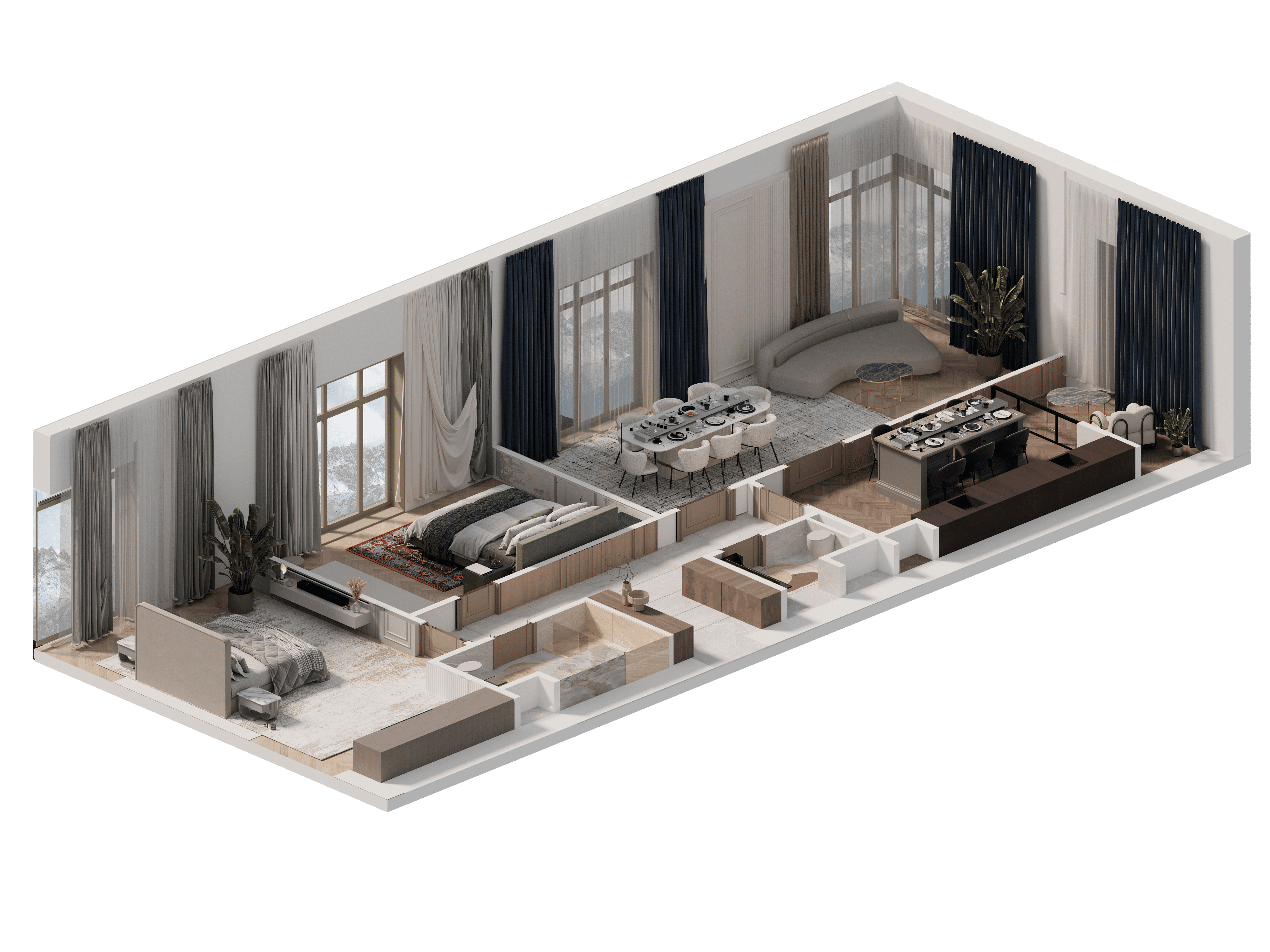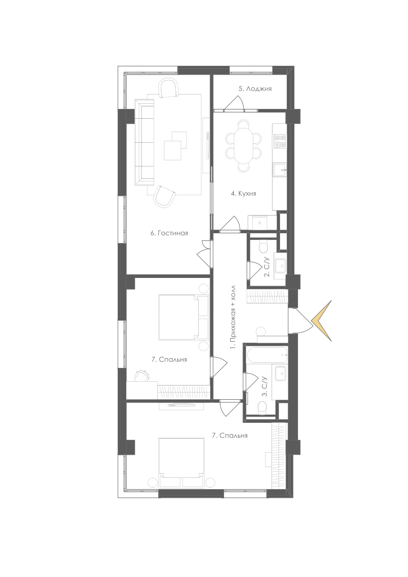Разделение на гостевую зону и приватные спальни.