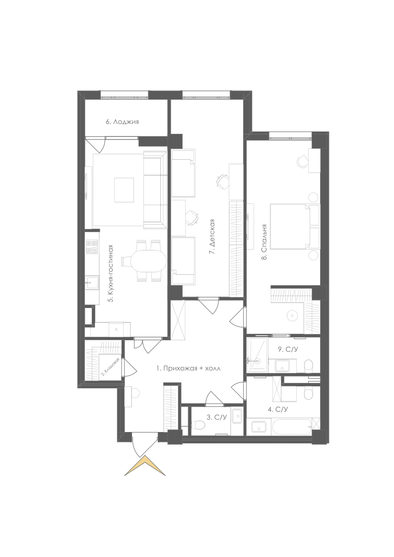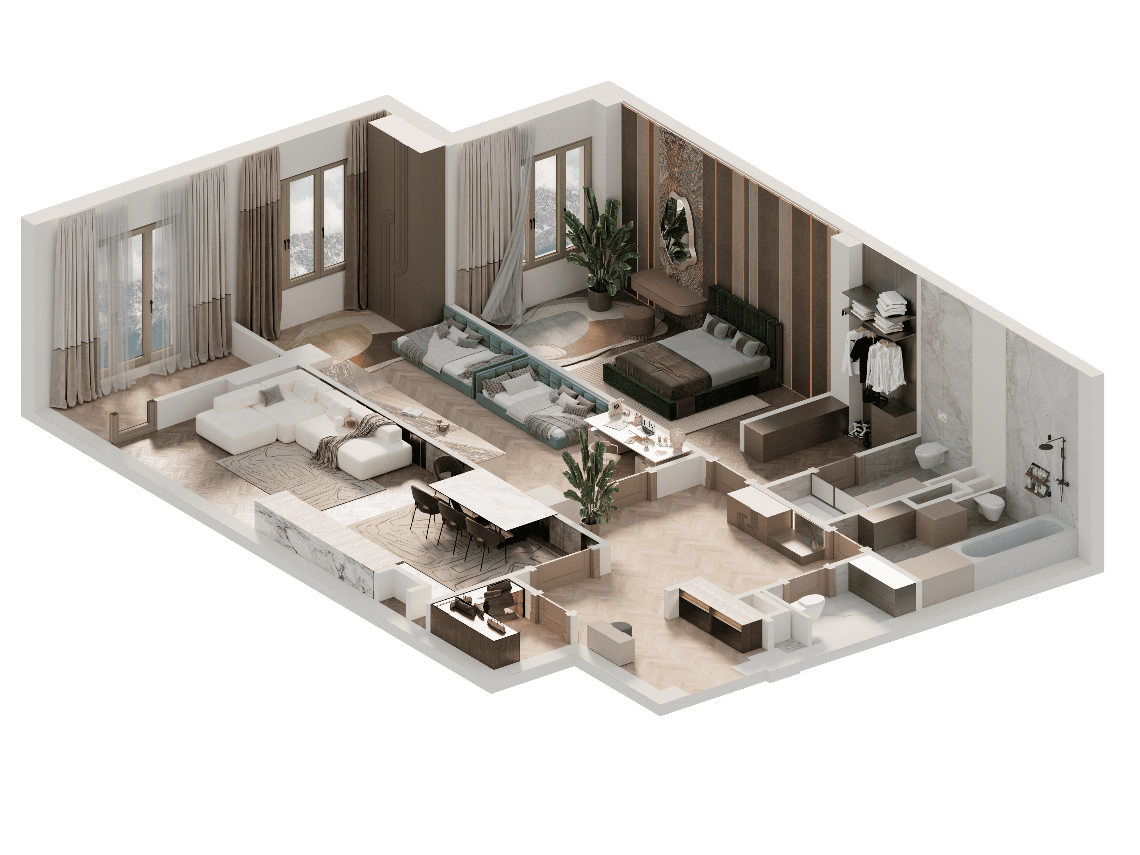 Окна выходят на хвойный парк, защищенный от шума дорог.