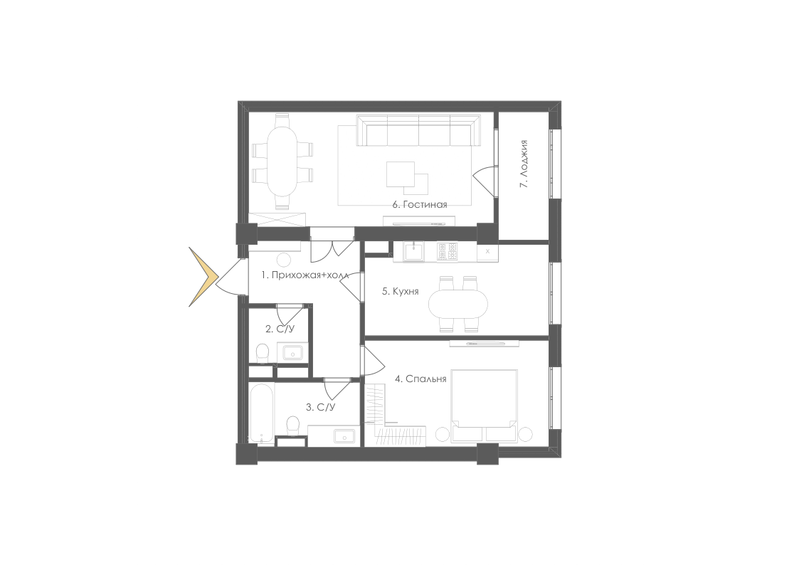 Все жилые комнаты правильной формы без выступов и лишних углов.